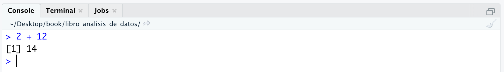Ilustraremos brevemente el uso del panel de código o script y la consola de R. Primero partiremos con la consola, ya que es más intuitivo e interactivo su uso. En la figura 7, hay una captura de una operación simple en la consola: aparece la instrucción o input 2 + 12, a la cual simplemente le damos enter, y obtenemos el resultado 14.