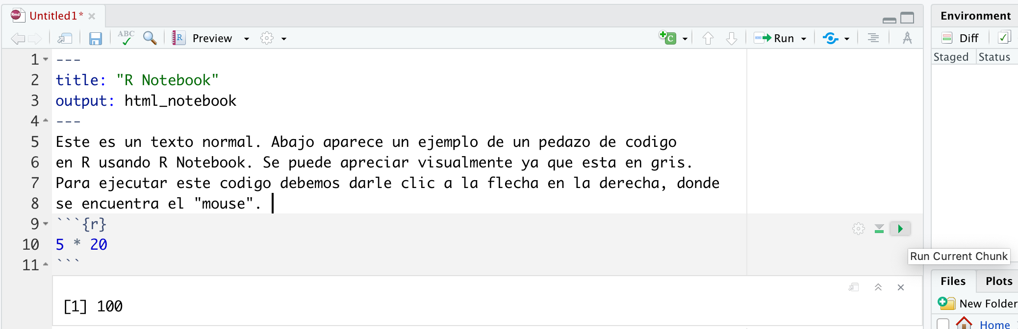 Hay dos maneras de crear un R Notebook. La forma más sencilla de crear uno es ir y dar clic en File →New file → R Notebook (El producto de esta acción se muestra en la Figura 10); la segunda es algo un “poco” más elaborada, es decir, usando una salida de notebook de html. En las líneas 1 a 4 de la figura 9, muestra un ejemplo de cómo generar un notebook con un tipo de escritura en html, al igual que el código que aparece abajo (nótese que éste debe estar escrito al inicio del script):